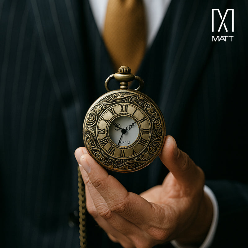 Nuestro reloj de bolsillo grabado es una pieza que evoca la elegancia atemporal. Con su caja metálica en acabado bronce envejecida y su carátula blanca de números árabes, este diseño combina sobriedad y practicidad en un accesorio lleno de estilo. Su tapa protectora abatible realza su carácter clásico, mientras que la cadena metálica asegura comodidad y presencia en cada ocasión.